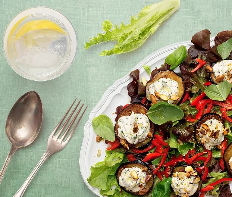 Sallad med aubergine, basilikafärskost och rostade pistagenötter
