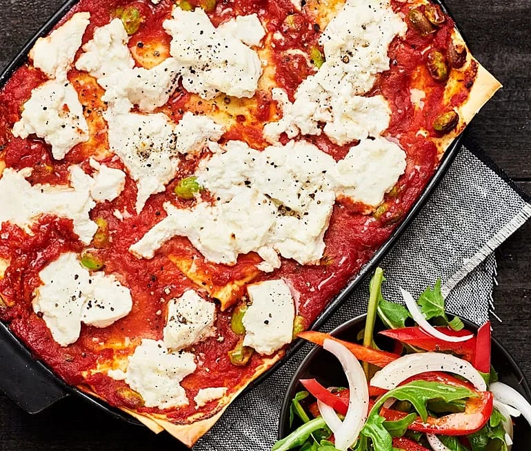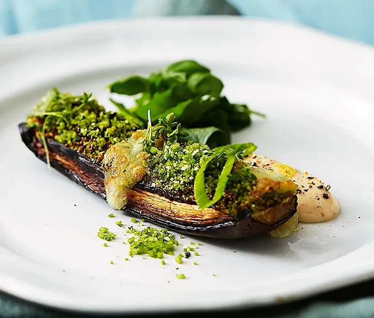Öppen lasagne med aubergine och krämig grönkålspesto