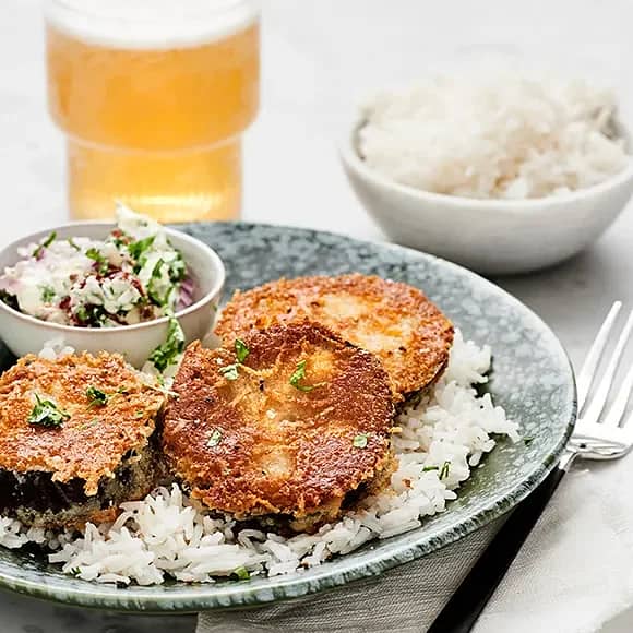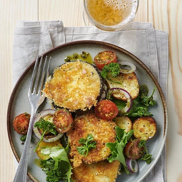 Parmesanpanerad aubergine med rostad rotfruktssallad