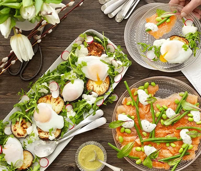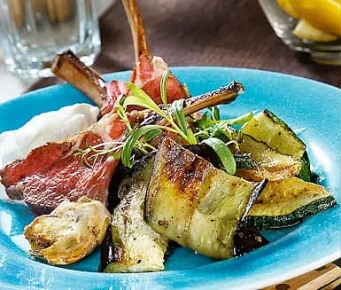 Grillad lammrygg med sparris i öländsk pesto, grillad aubergine och rostad vitlök