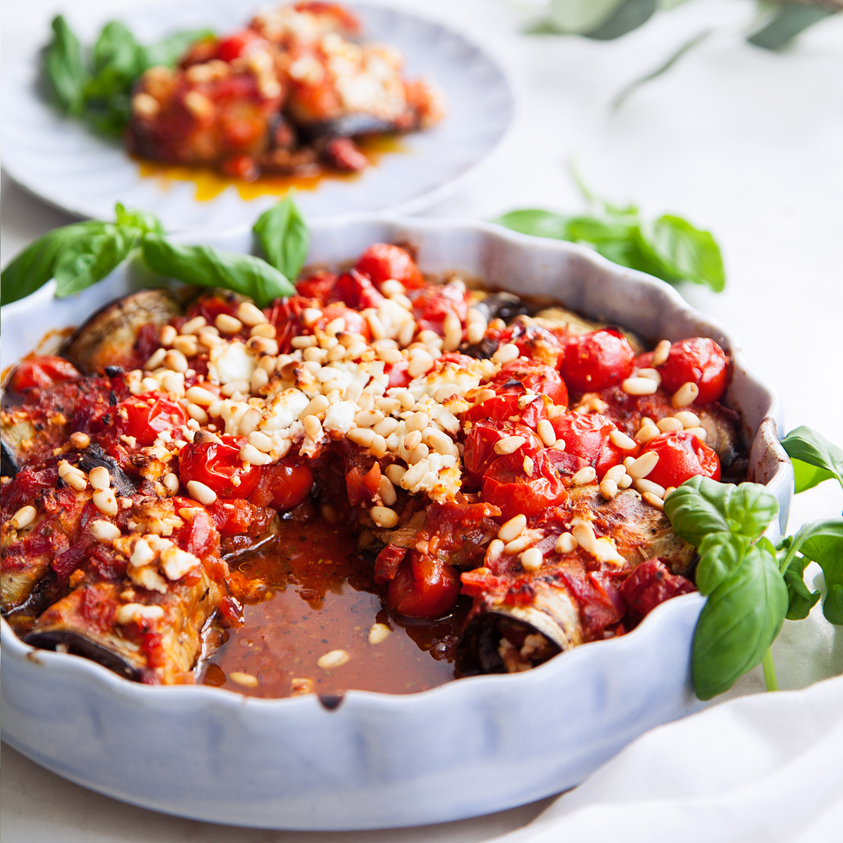 Fetaostfyllda auberginerullar i rökig tomatsås