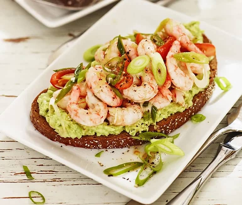 Heta räkor och avokado i gemsalladsskålar med citron- och örtdipp
