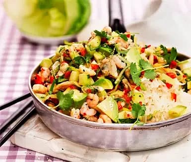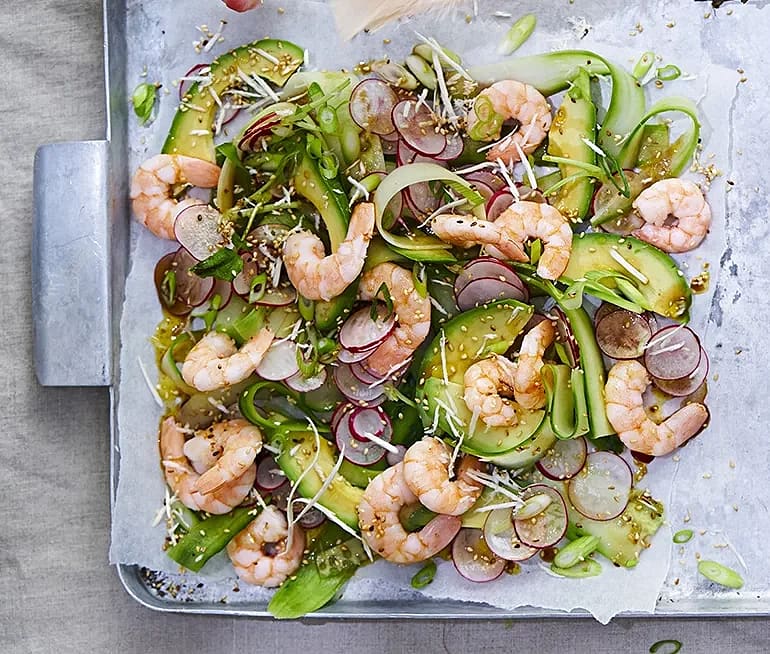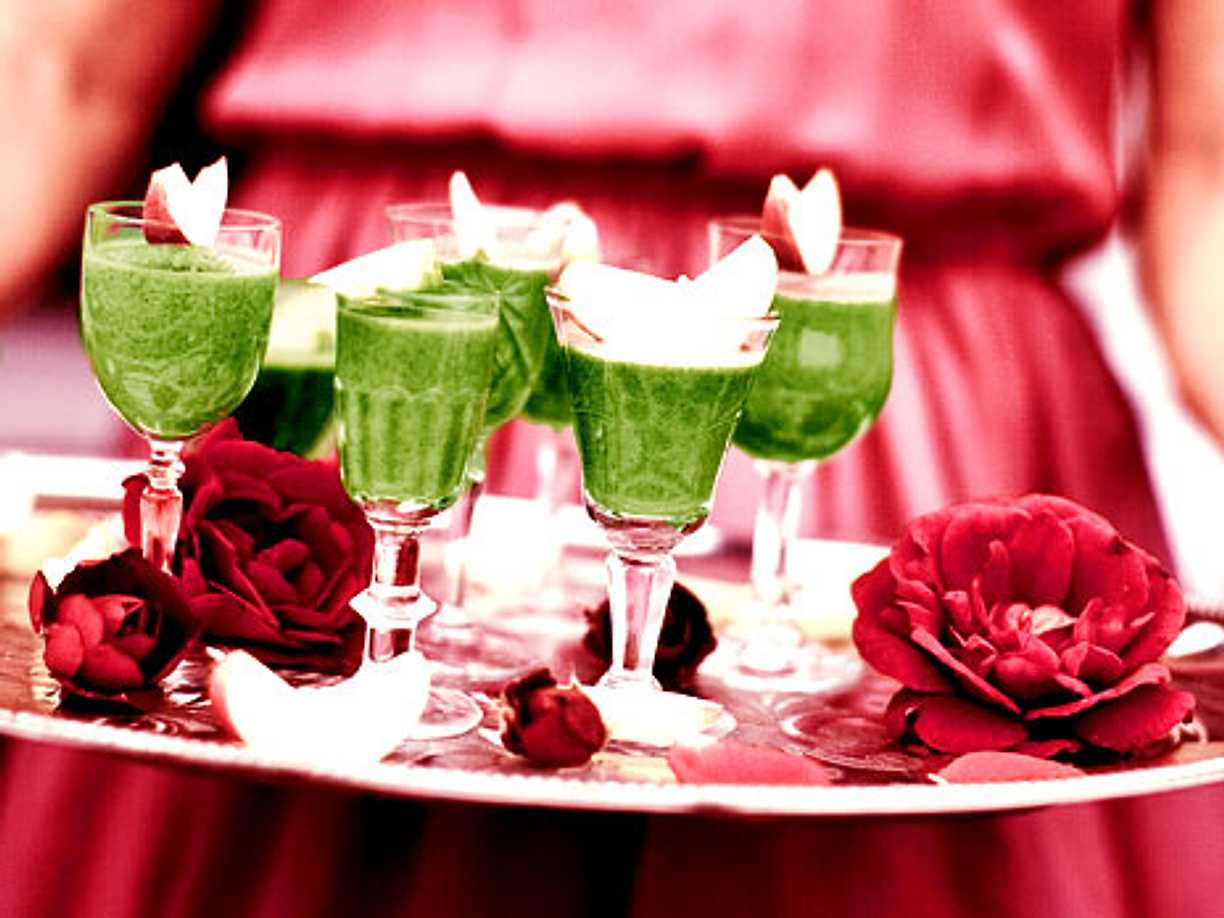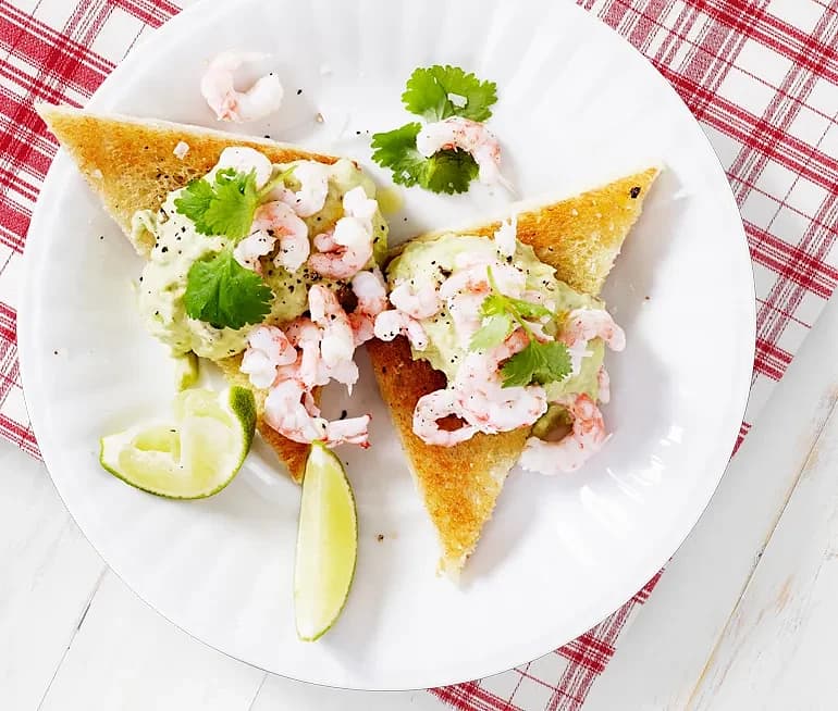 Avokado- och grön ärtsoppa med räkor, ärtskott och chiliflakes