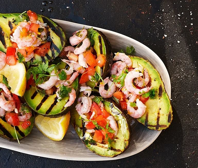 Grillad avokado med räkor, vitlök och körvel