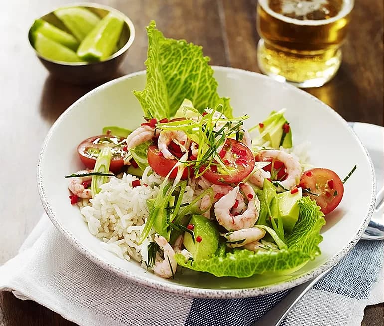 Limedressad scampisallad med mango, avokado och rödlök