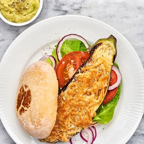 Parmesangratinerad aubergineburgare med avokadoröra