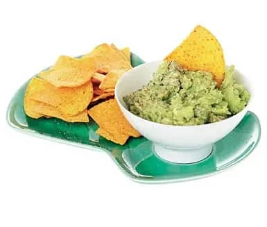 Het böngryta med avokadoröra och majsnachos