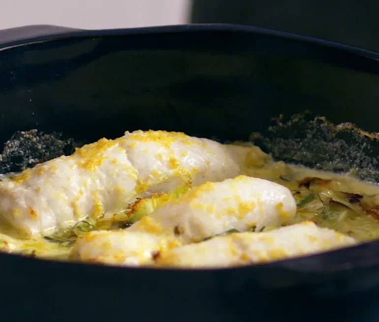 Bakad koljafilé med morötter, kalamataoliver och silverlök