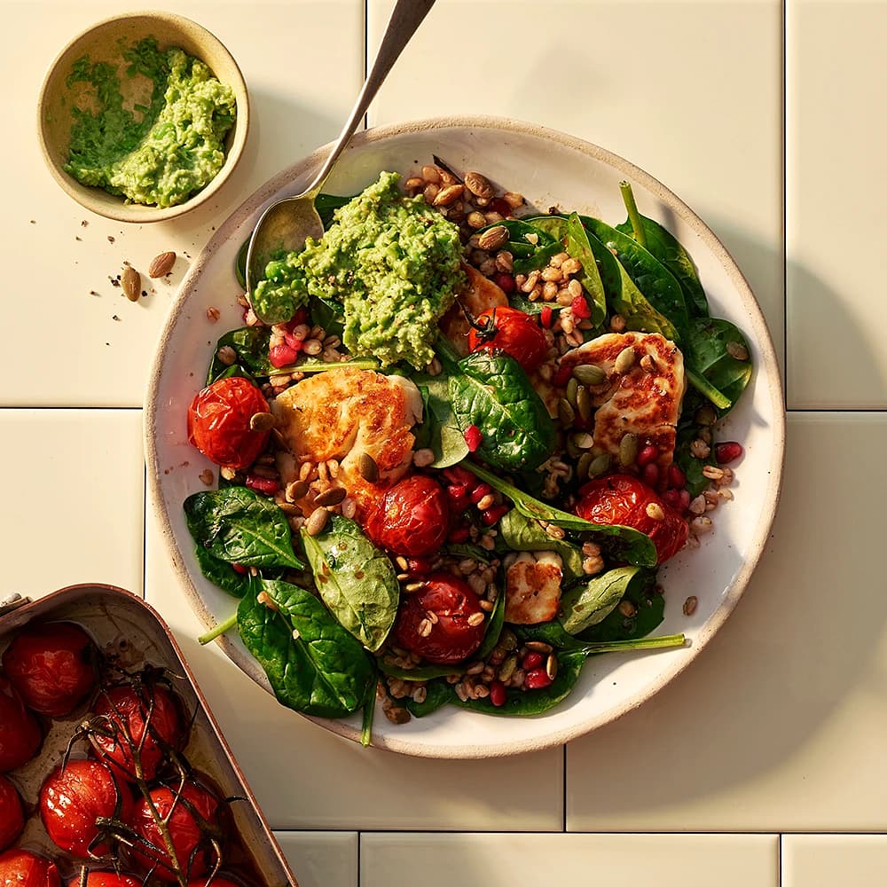 Örtstekta lammracks med grön kikärtsröra, bakade tomater och brödsmul