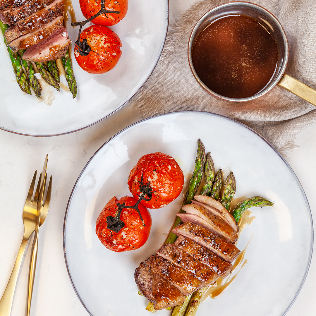 Stekt ankbröst med sparris, bakade tomater och dillolja