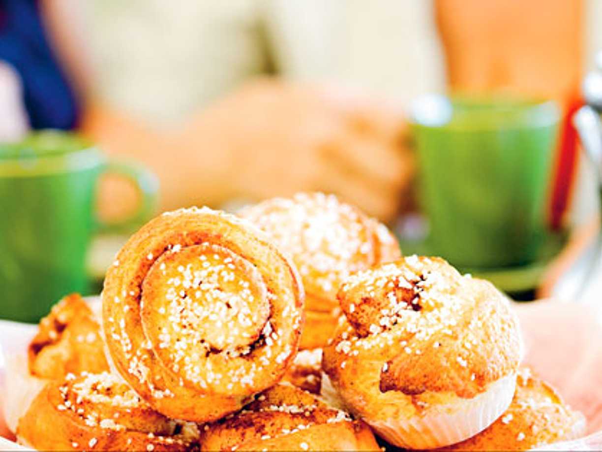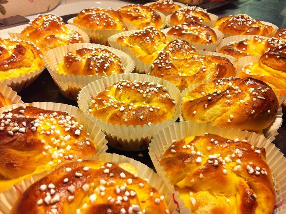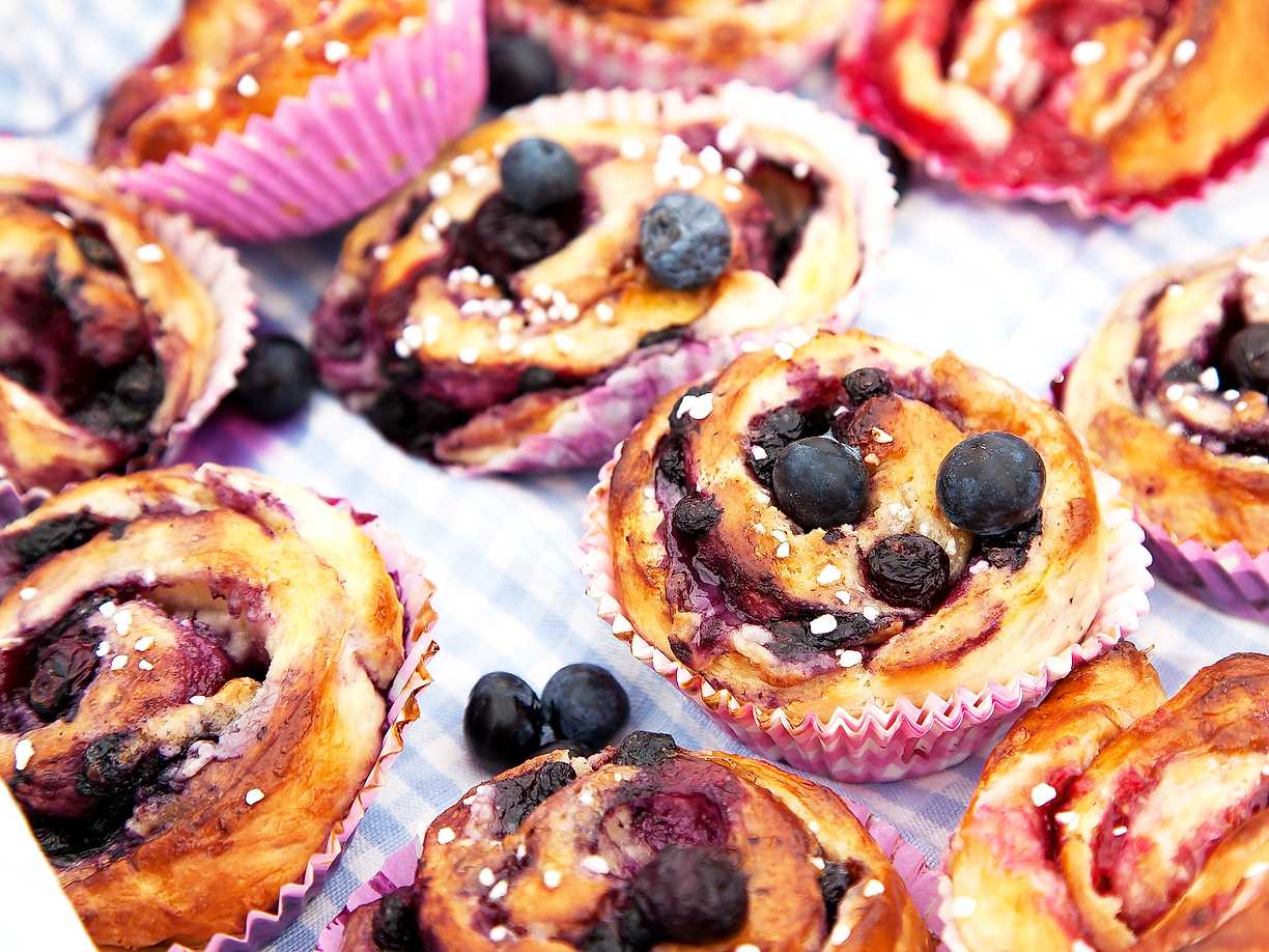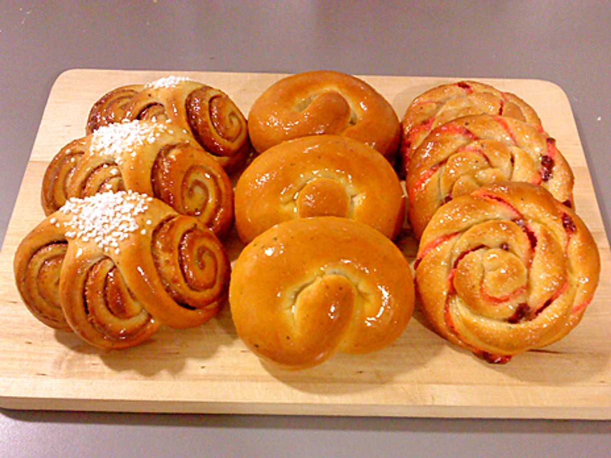 Äpple- och kanelkrans, toscabullar med pecannötter, blåbärs- och vaniljbullar