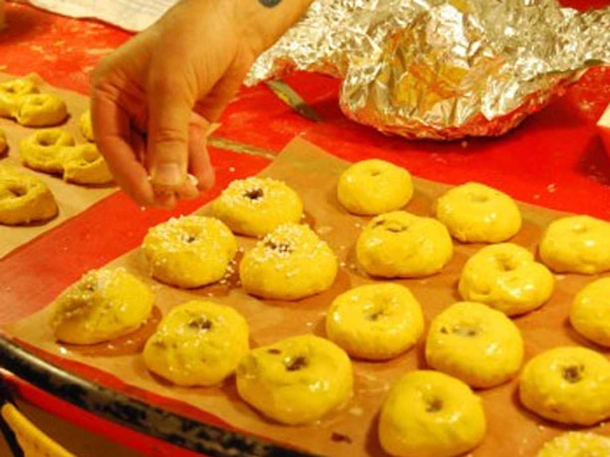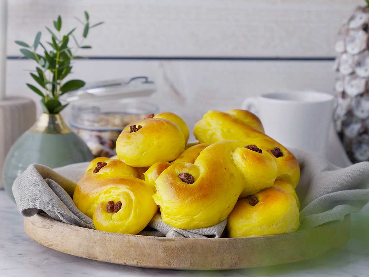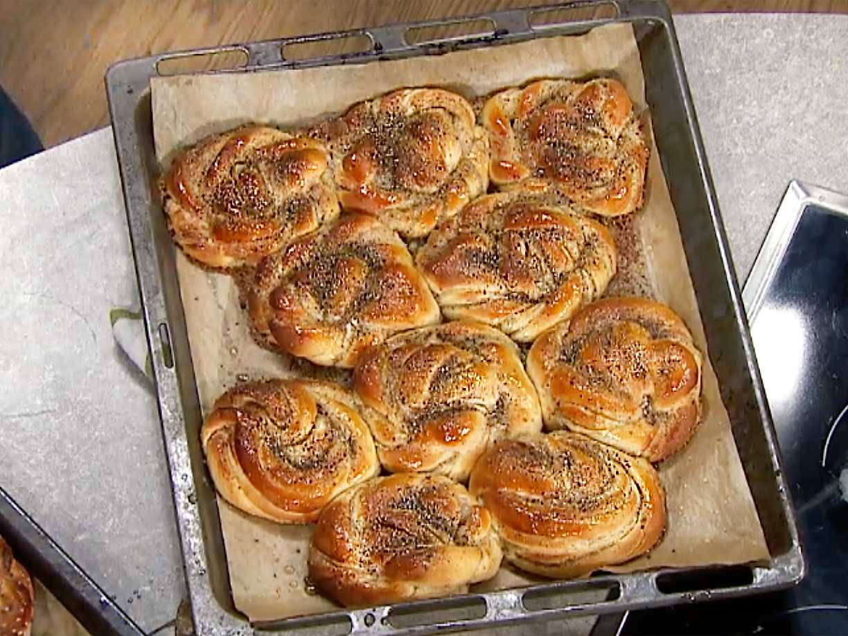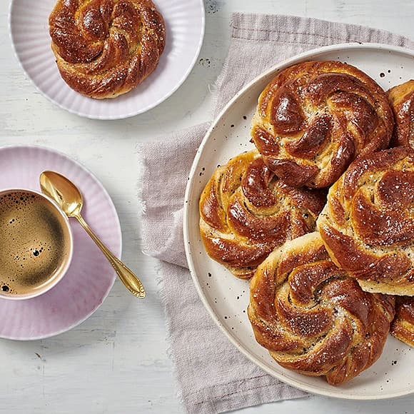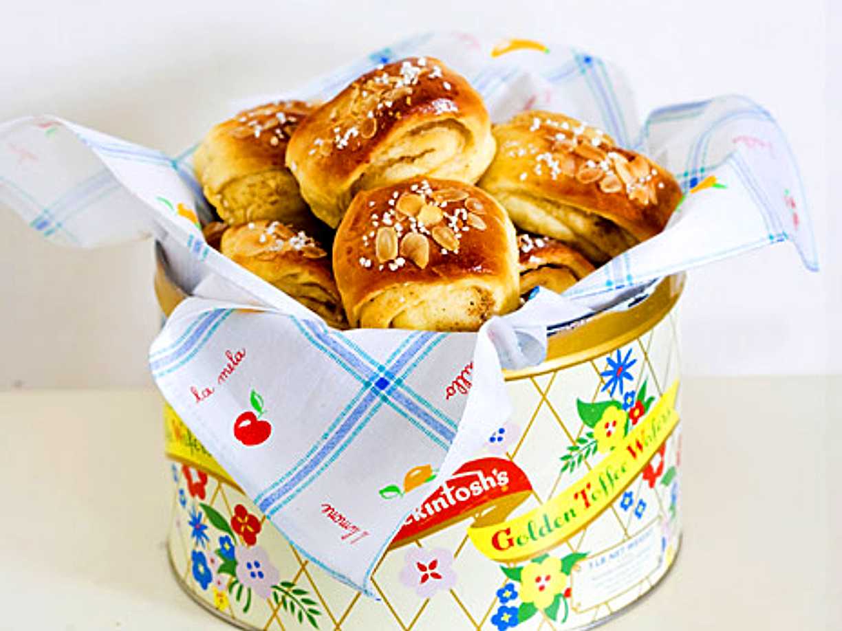 Äpple- och kanelkrans, toscabullar med pecannötter, blåbärs- och vaniljbullar
