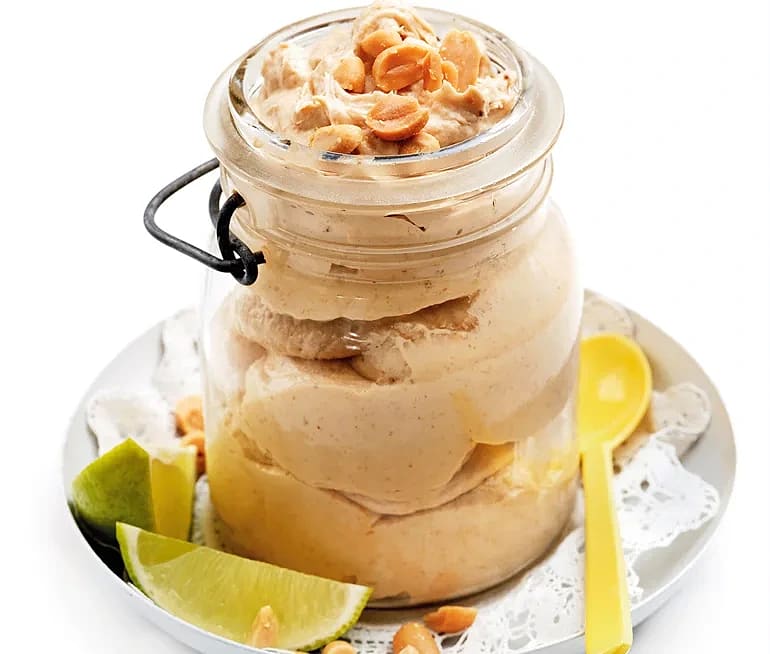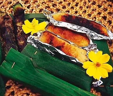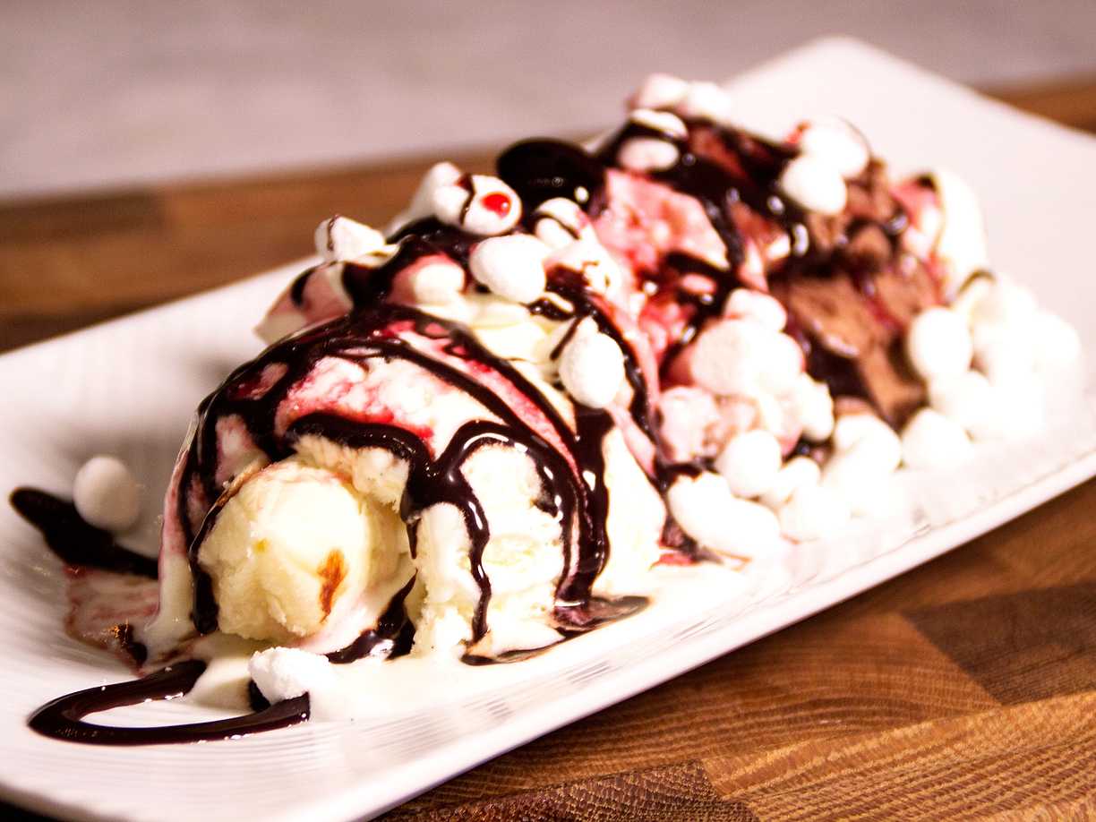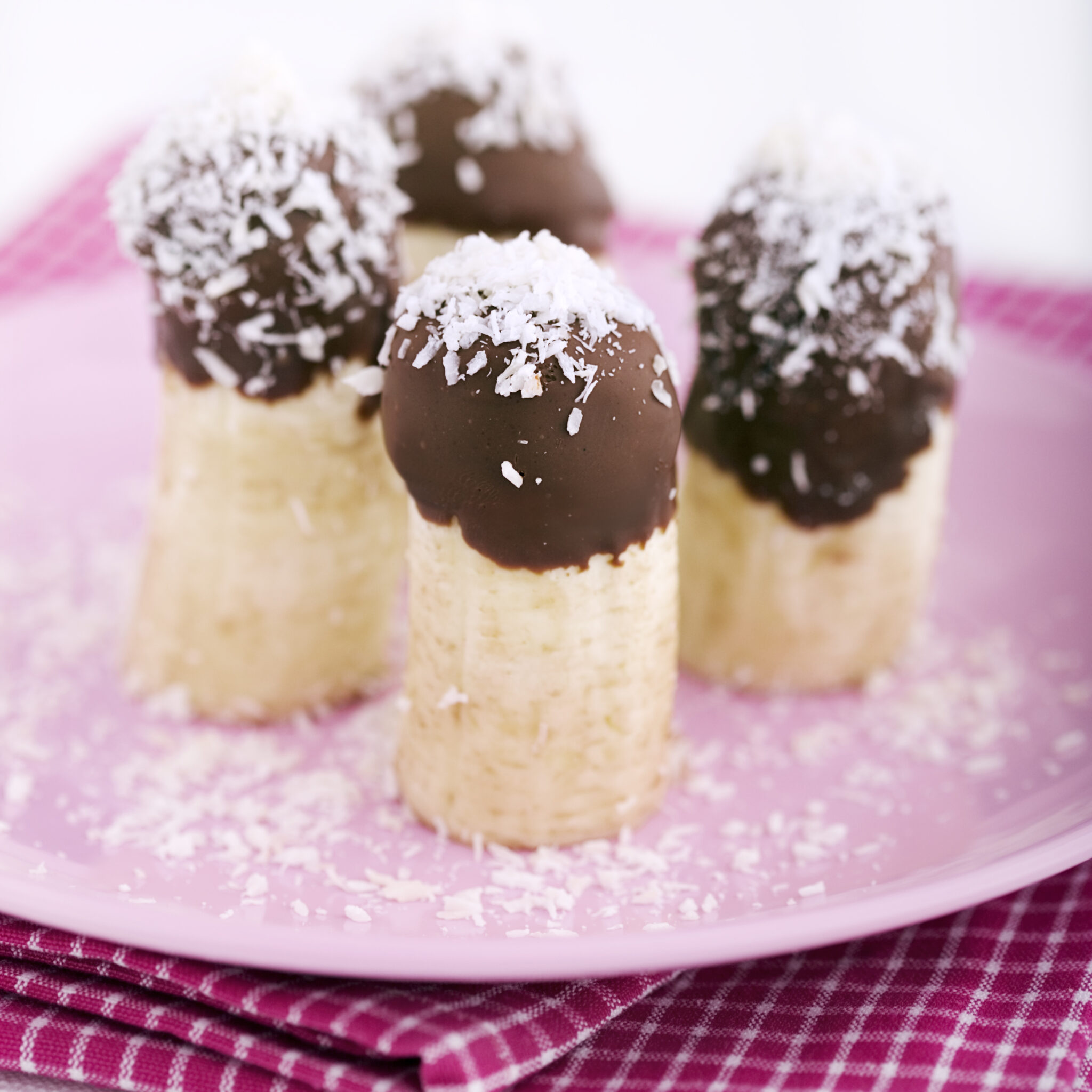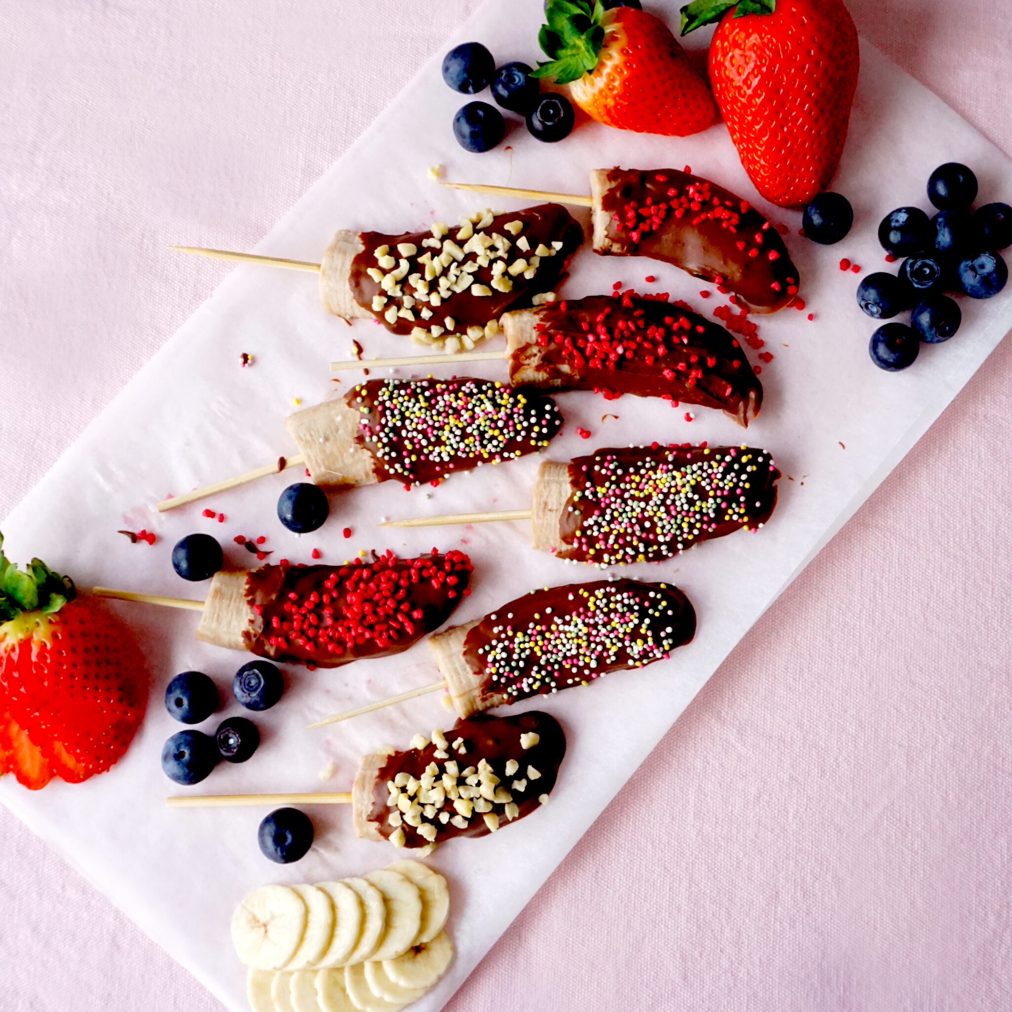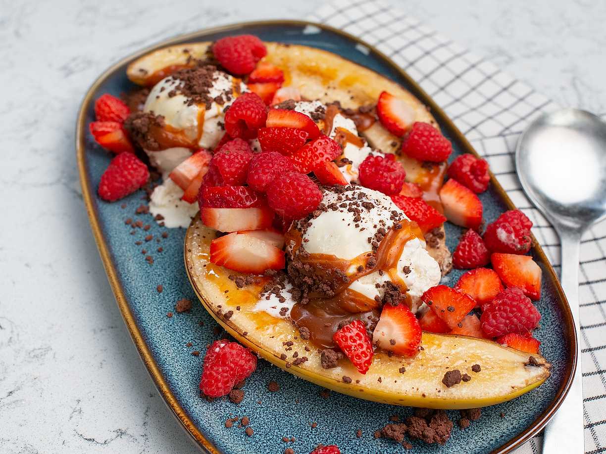 Grillad banan med kokos- och chokladtopping och frozenyoghurt