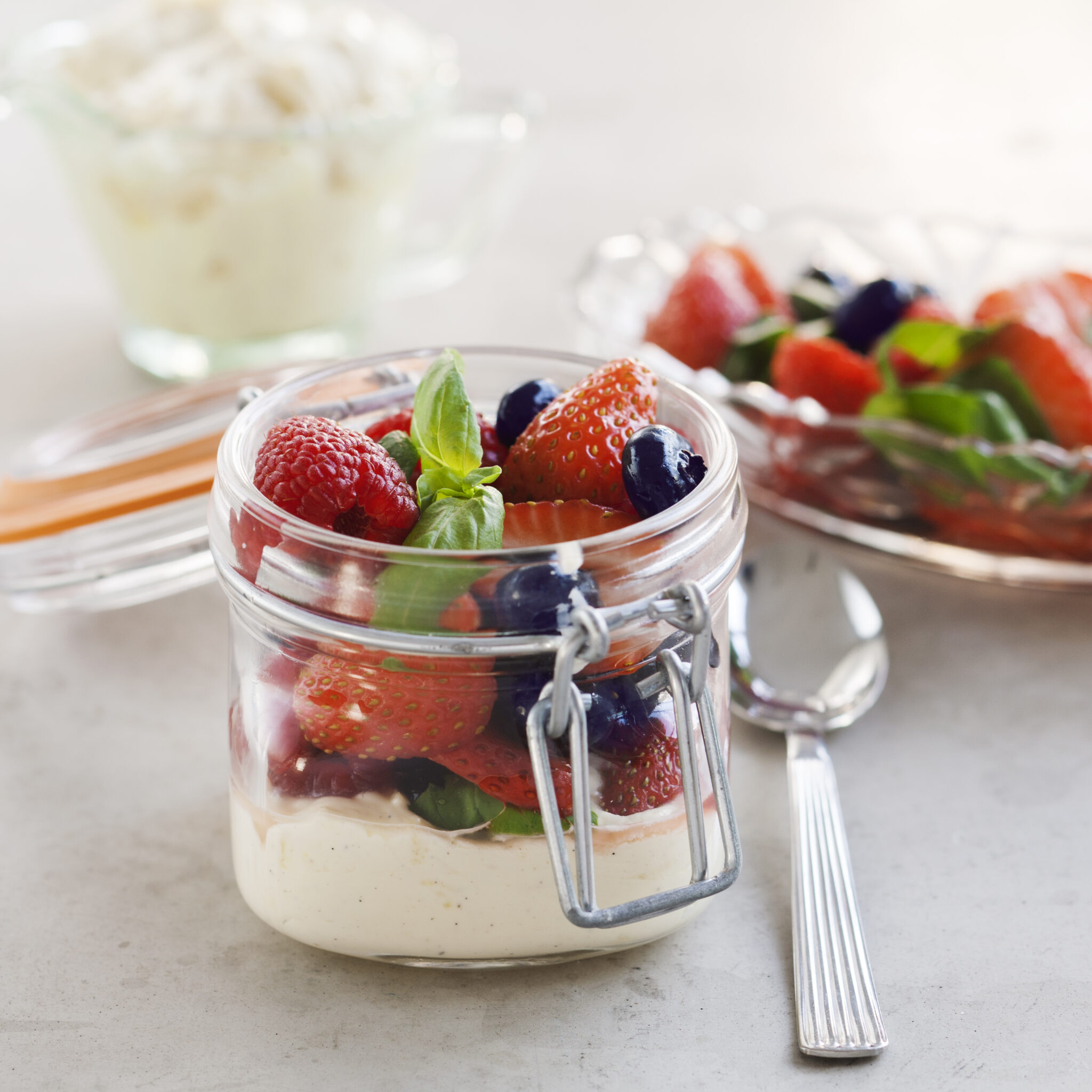 Färskostmousse med bär, basilika, kardemumma och kaksmulor