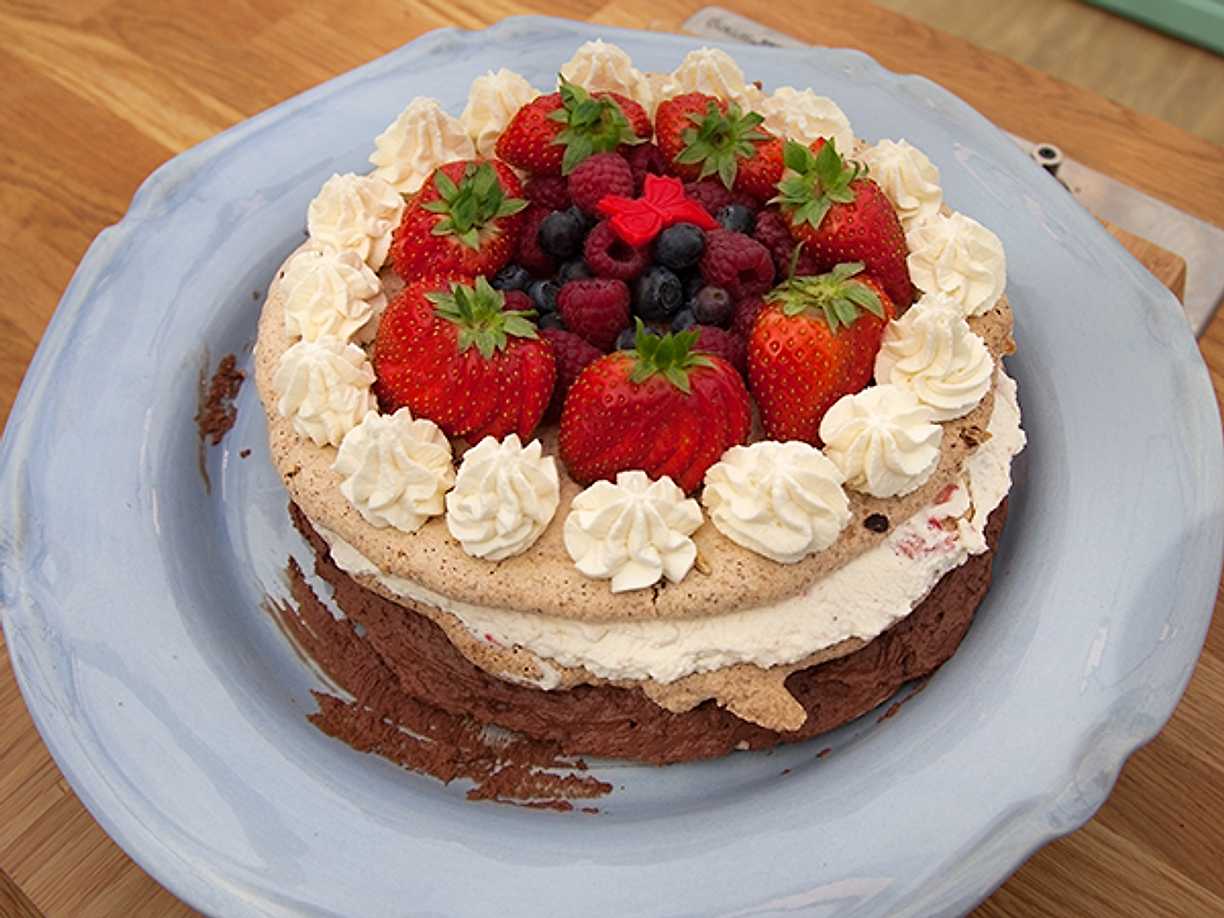American dream - tårta med maräng, mjölkchoklad och färska bär