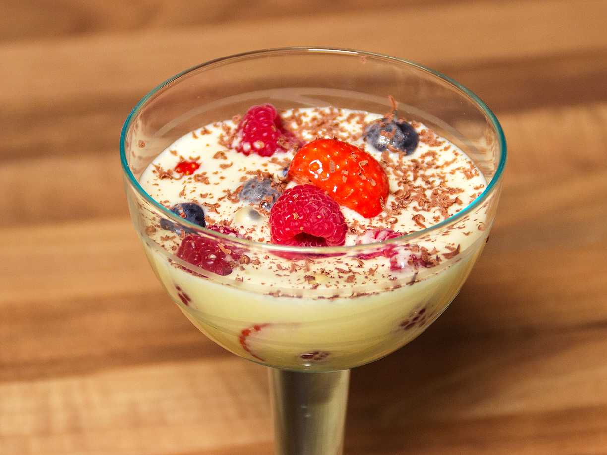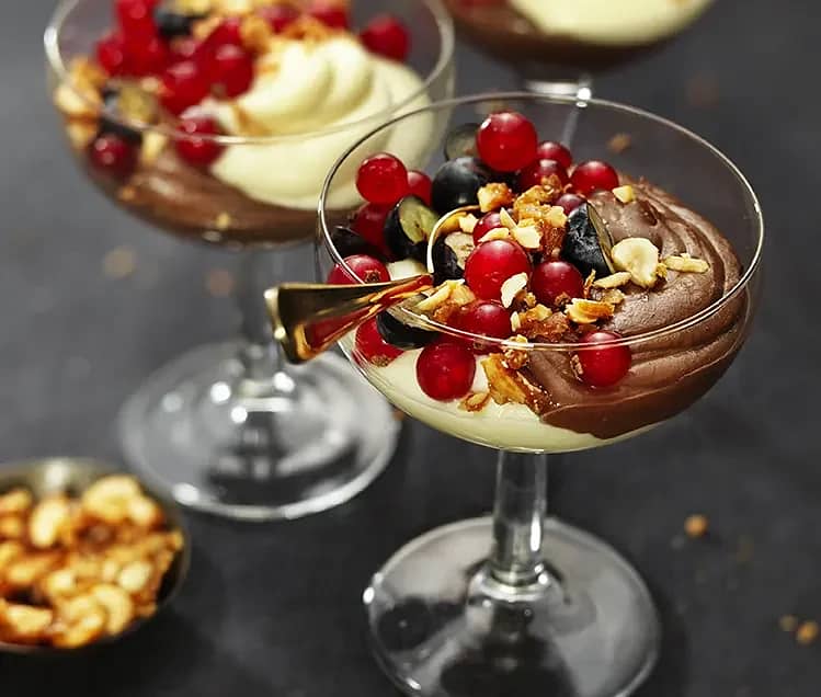 Chokladmousse på två sorters choklad, serveras med färska bär