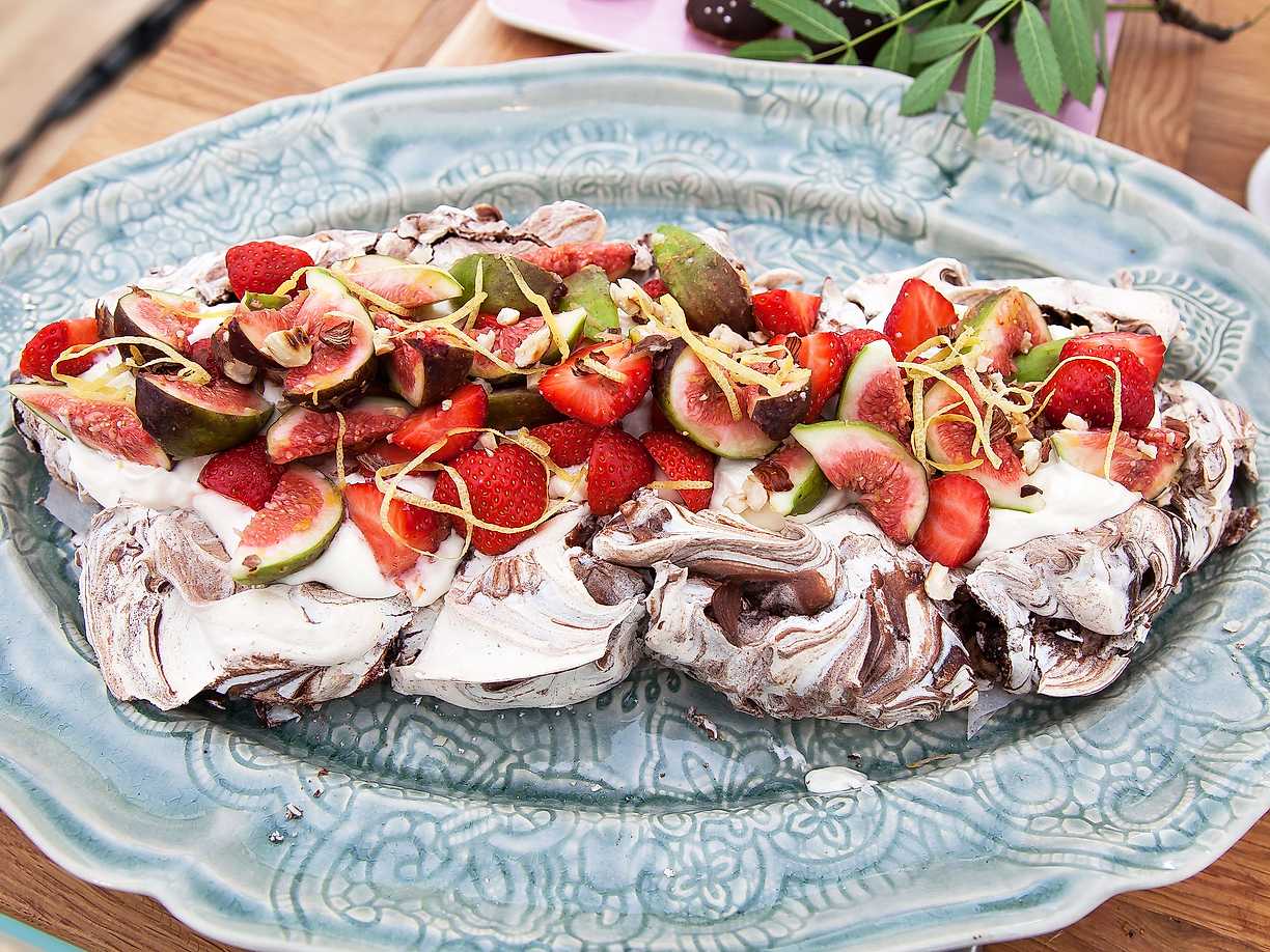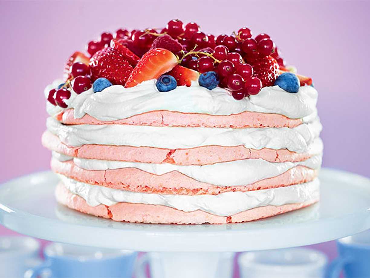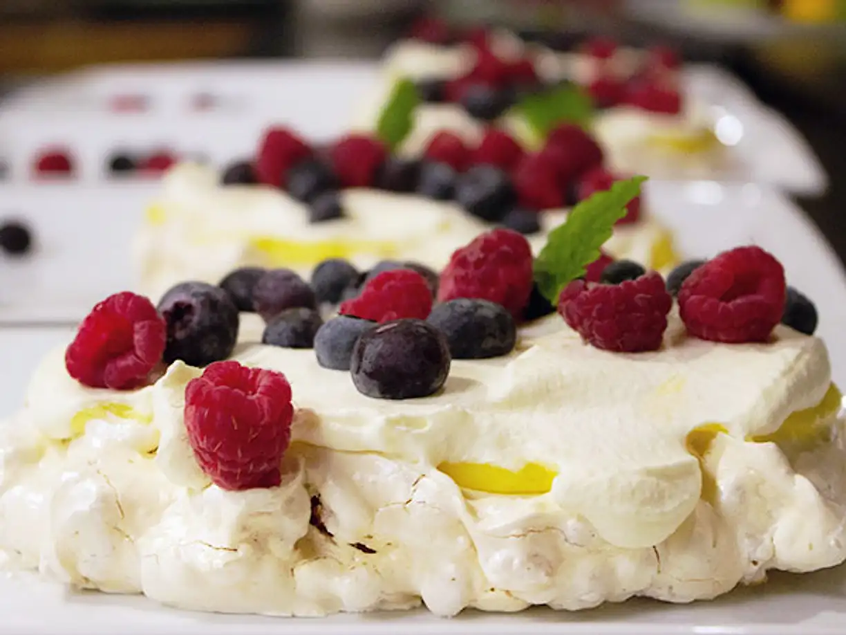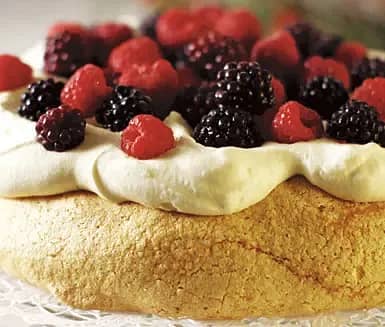 Rice krispies-pavlova med vaniljsmörkräm och färska bär