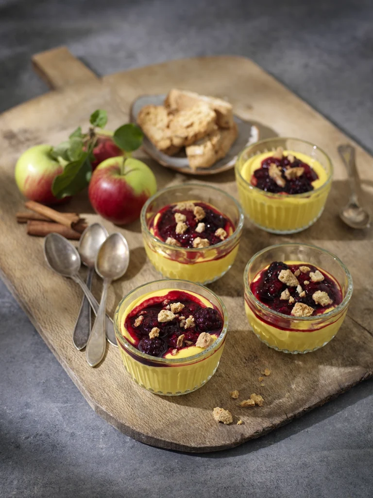 Chiapudding med kokos, lime och lakritsmarinerade bär