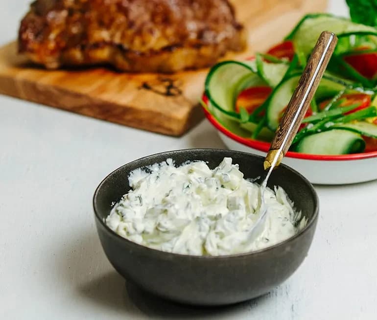 Sallad med hyvlad zucchini, silverlök, basilika, mozzarella och parmaskinka