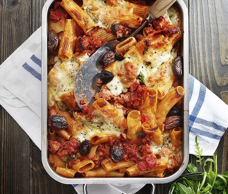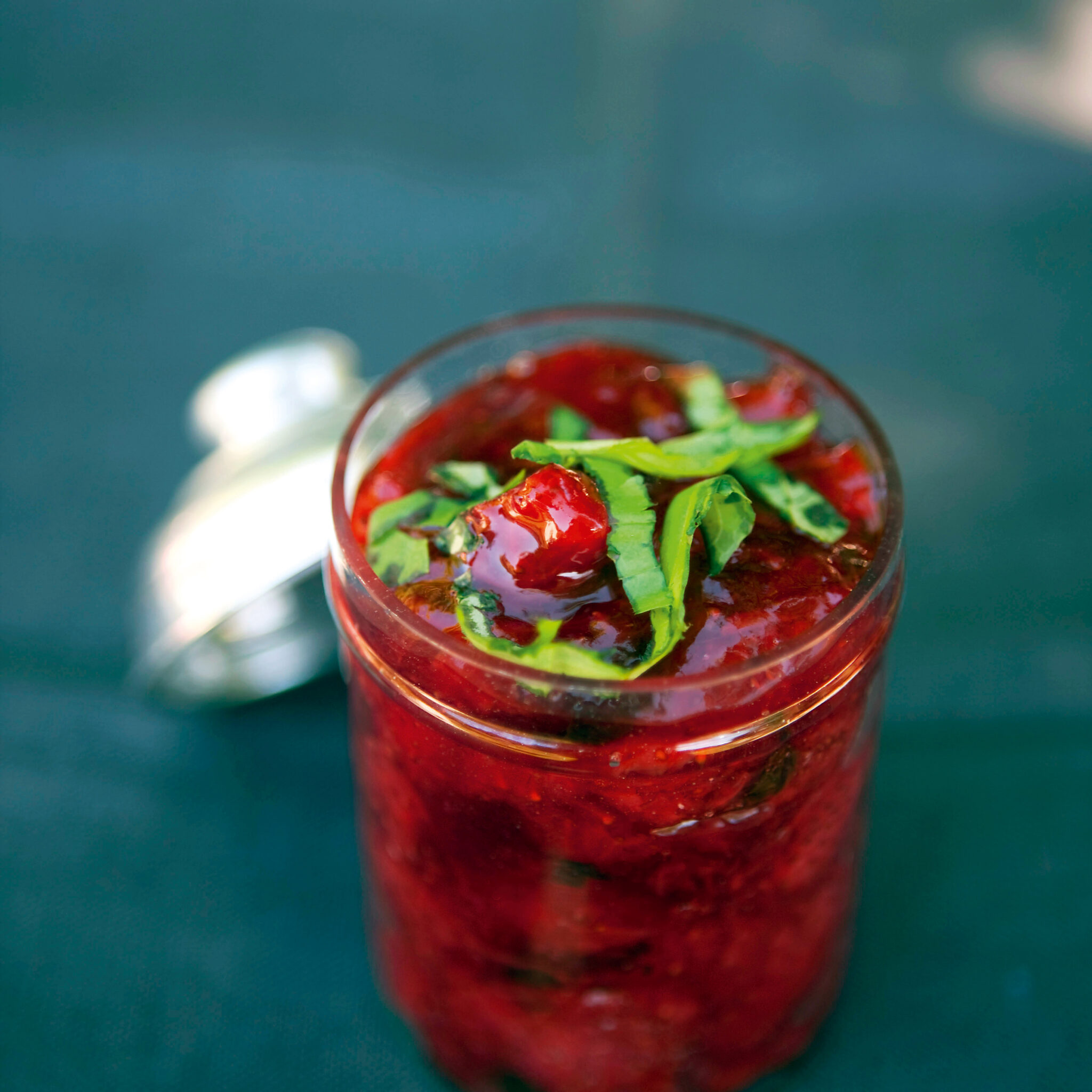 Italiensk kycklinggryta med soltorkade tomter, basilika och vitlök.