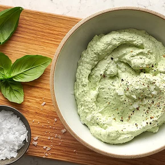 Vitlöksstekta kycklinglår med ärt- och basilikakräm