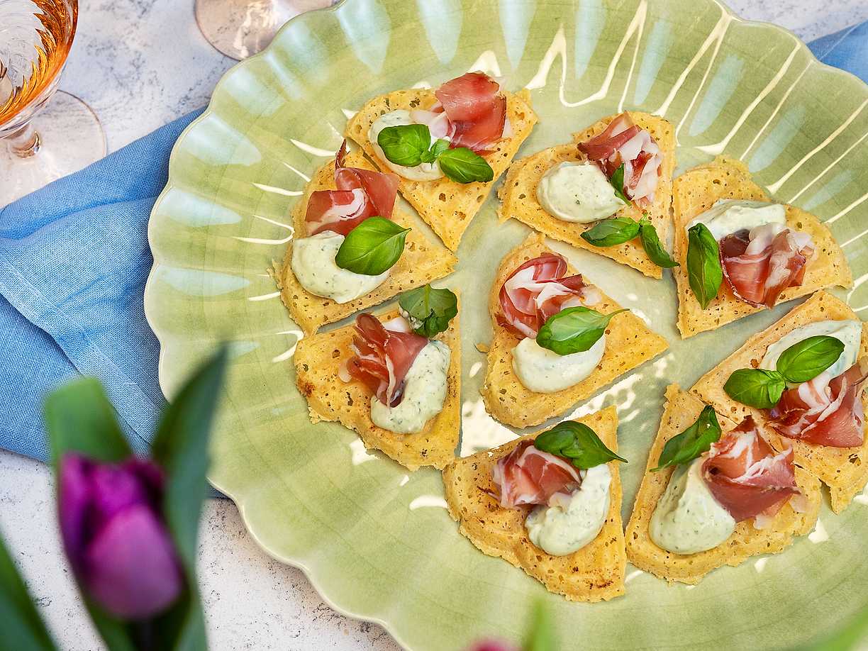 Busenkla ostsnittar med prosciutto och basilikakräm