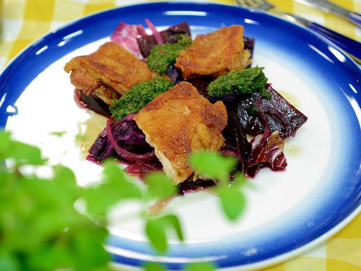 Kantarellcrêpes med betsallad, krondill och kryddost