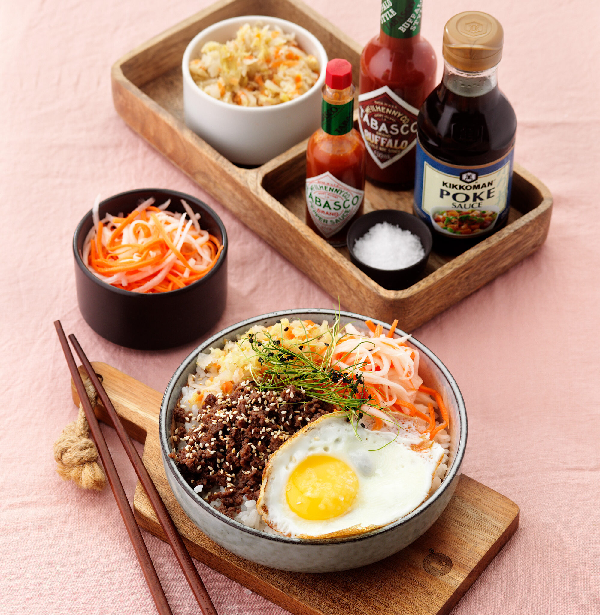 Bibimbap med hängmörad ryggbiff och chilipicklad gurka