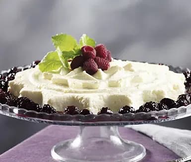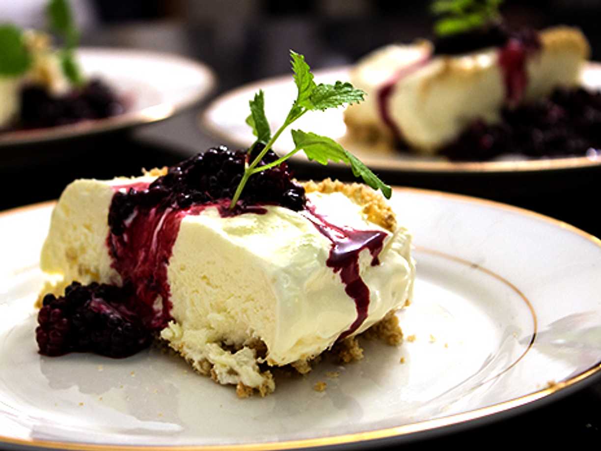 Cheesecake med mandel och vanilj, serveras med björnbär från Söderö