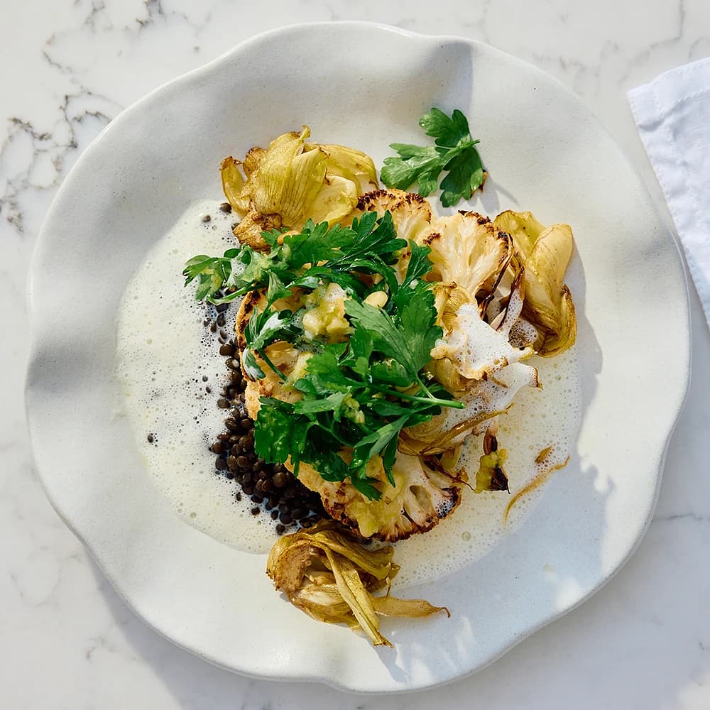 Ugnsbakad blomkål med fetakräm och belugalinser