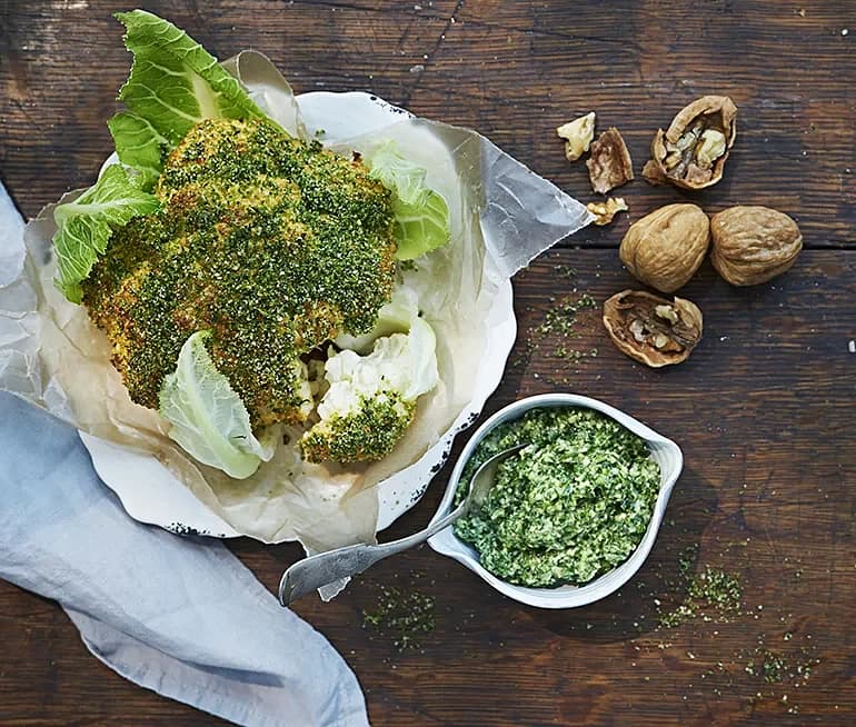 Basilika- och senapsgriljerad blomkål med grönkålspesto