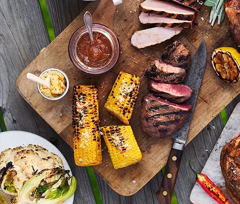 Grillad innanlårskappa med majskolv, kryddsmör, blomkål och kaprisvinägrett
