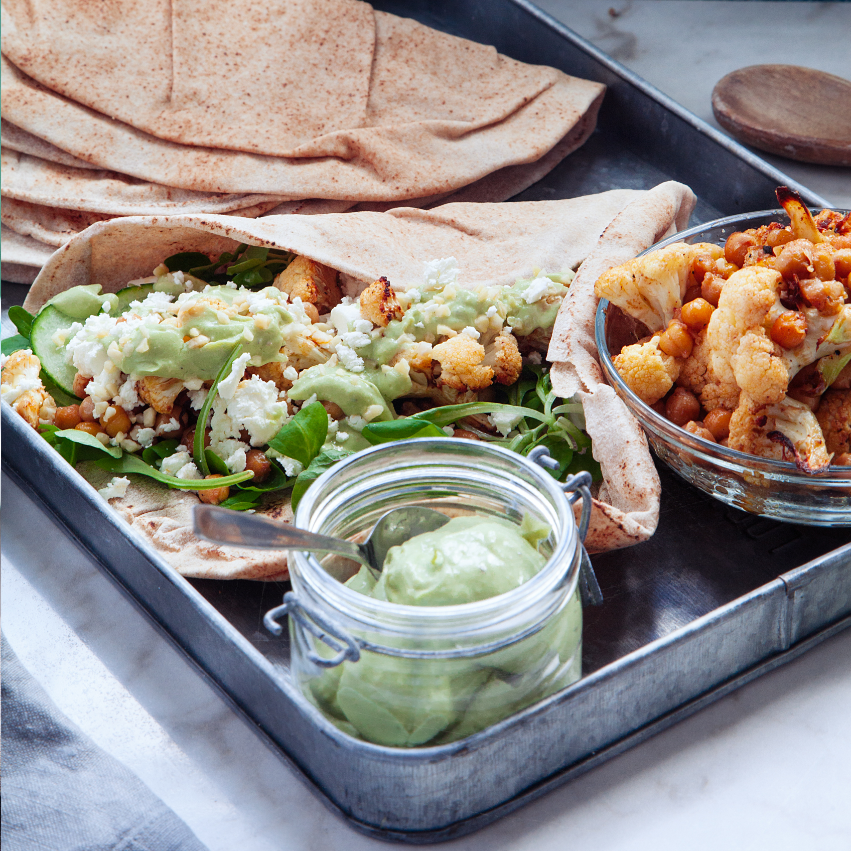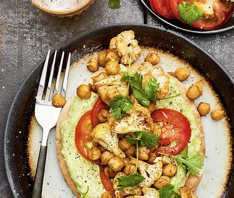 Pitabröd med kryddrostad blomkål och avokadokräm
