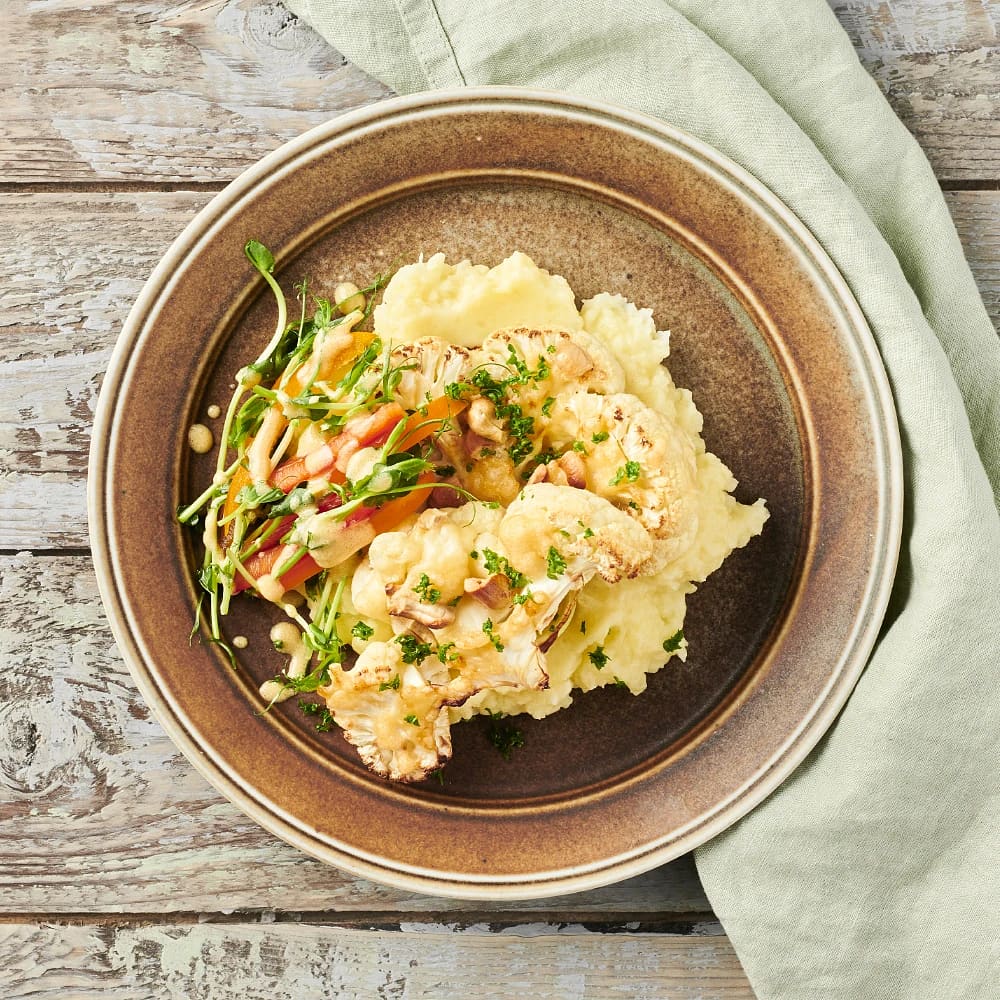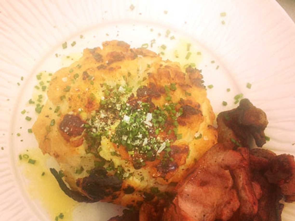 Örtbakad blomkål med fuskbea och pommes Anna