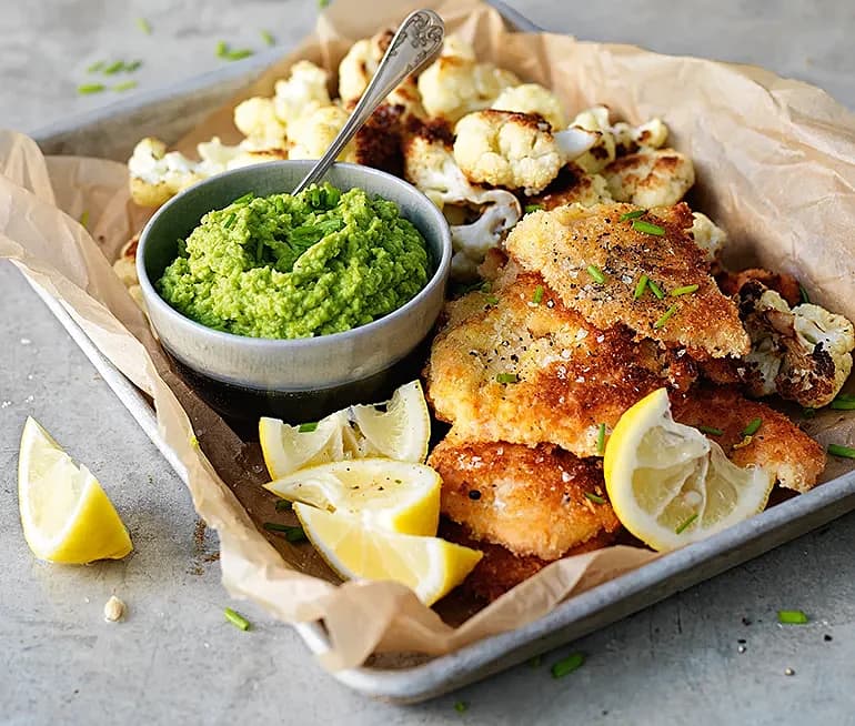 Rostad blomkål, laxschnitzel och ärtkräm med chili