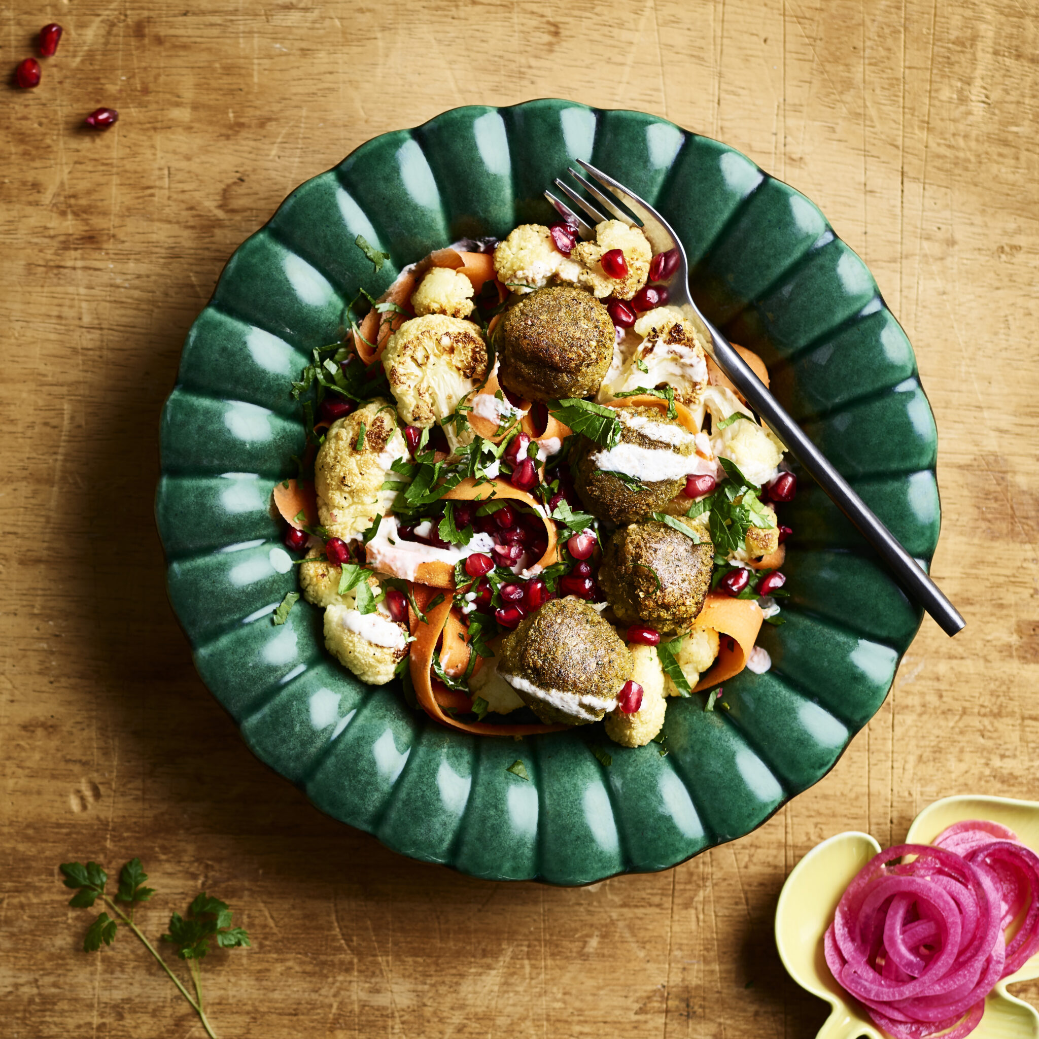 Kikärtsbollar med ugnsbakad blomkål och tahiniyoghurt