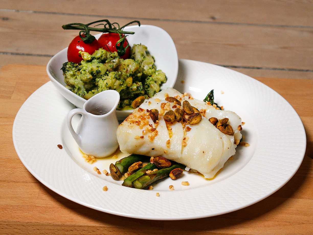 Smörstekt torskrygg med pestoslungad blomkål och sparris