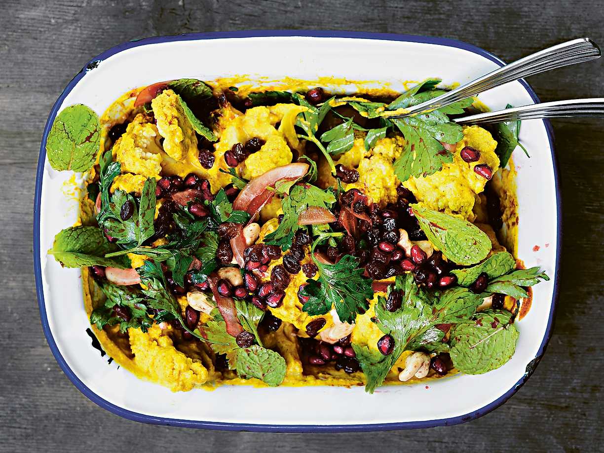 Indisk blomkålsgratäng med granaptäppelsallad