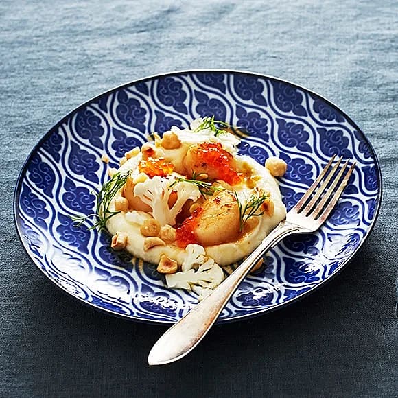 Halstrade pilgrimsmusslor med brynt sojasmör och blomkålspuré