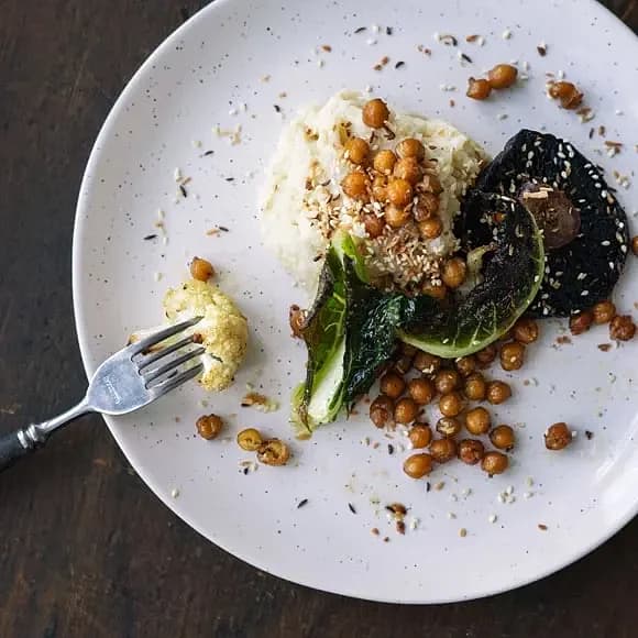 Blomkålspuré med kikärtor, portabello och dukkah