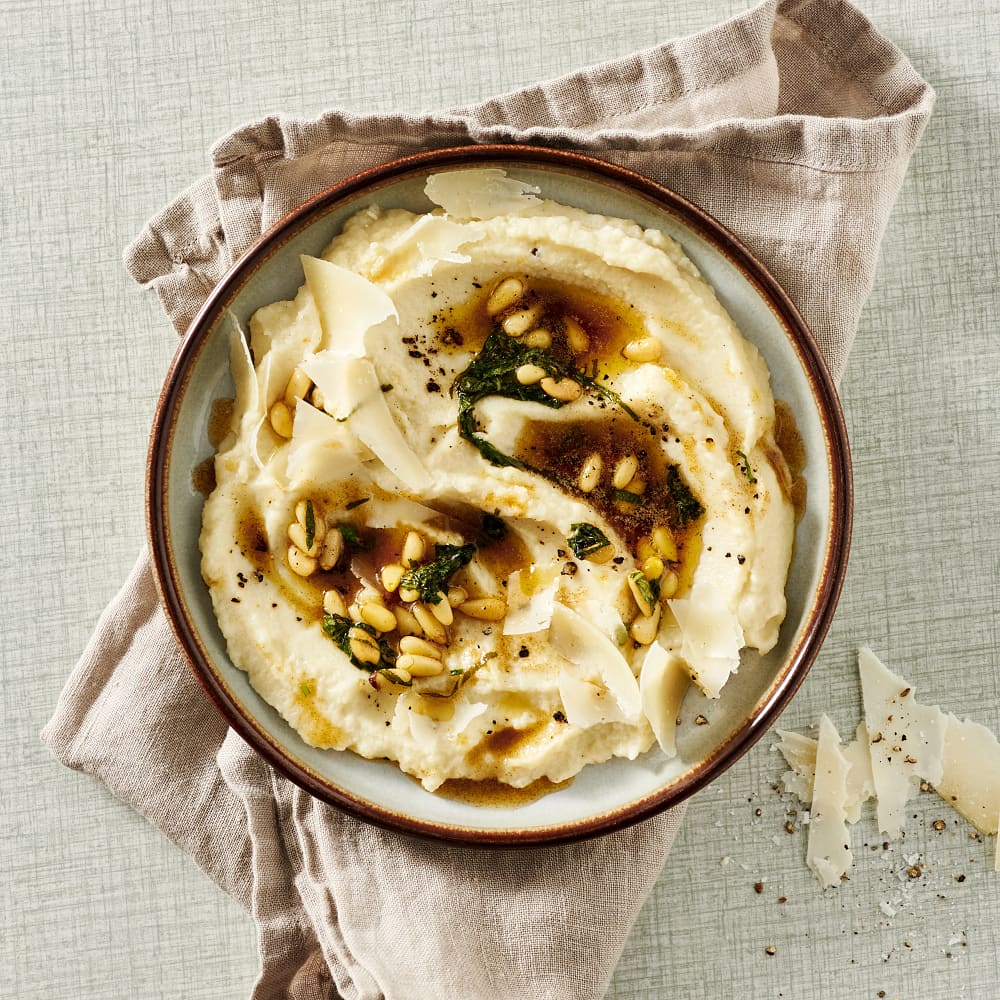 Blomkålspuré med brynt basilikasmör och parmesan