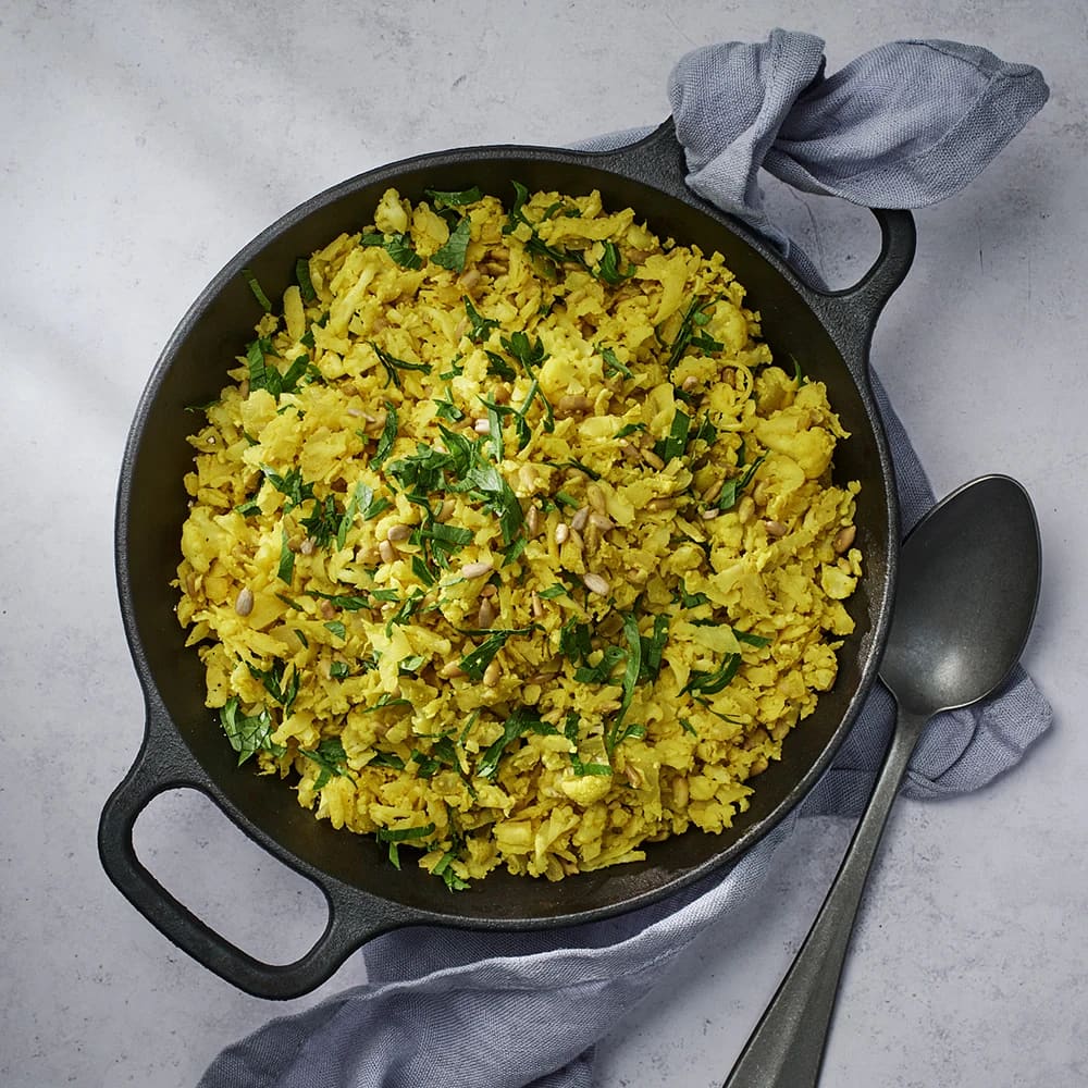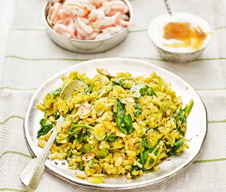 Stekt blomkålsris med spenat, mandel och curry