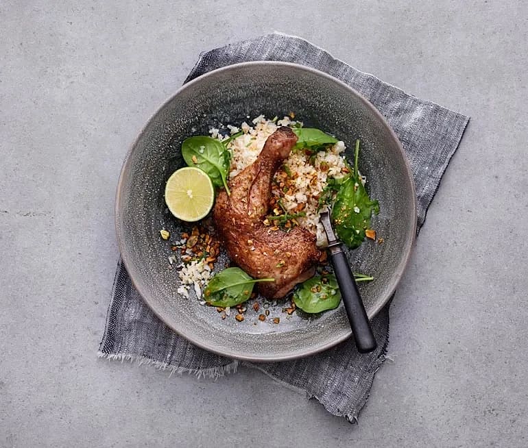 Ugnsbakade kycklinglår med blomkålsris och spenatdipp
