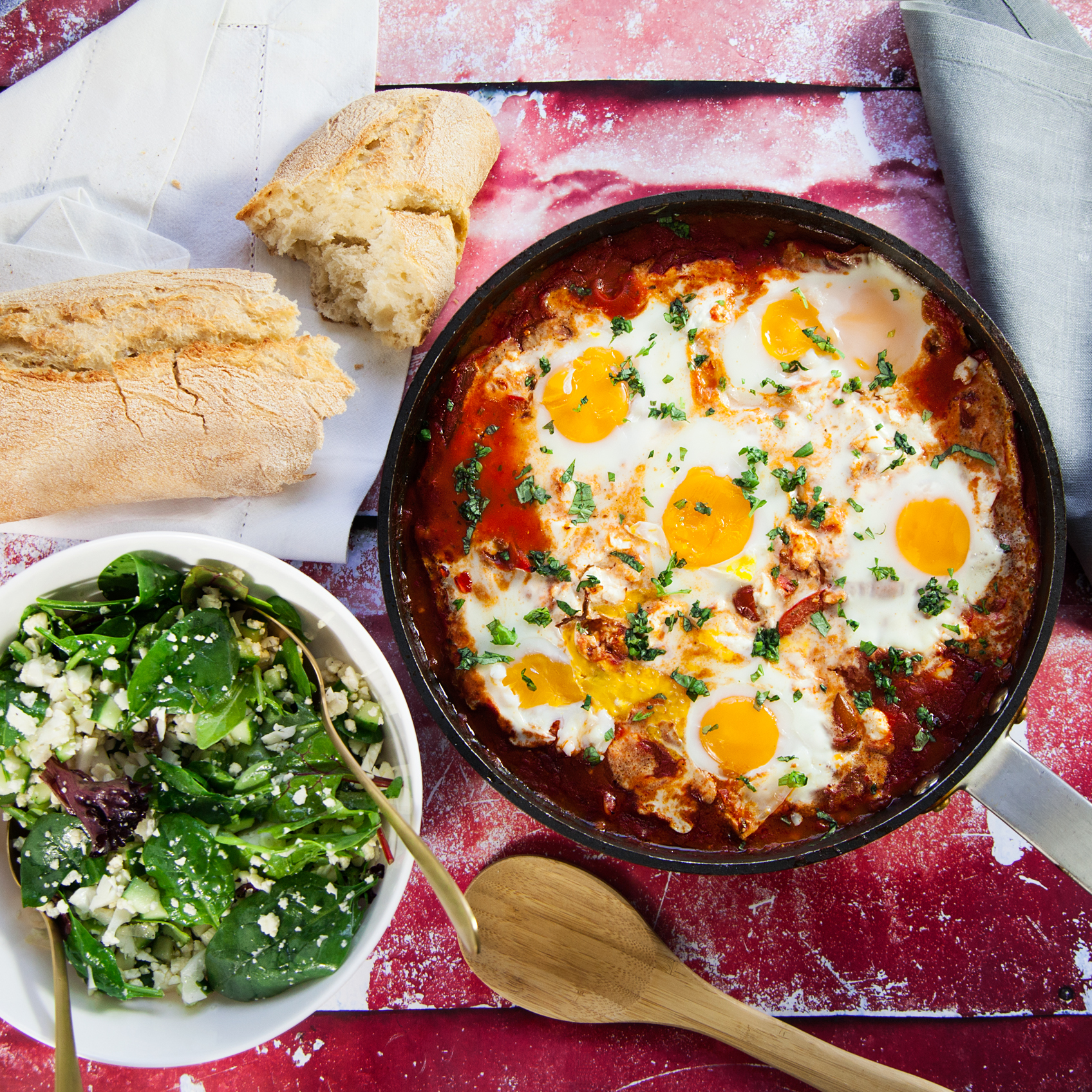 Shakshuka med feta, varmt bröd och blomkålssallad