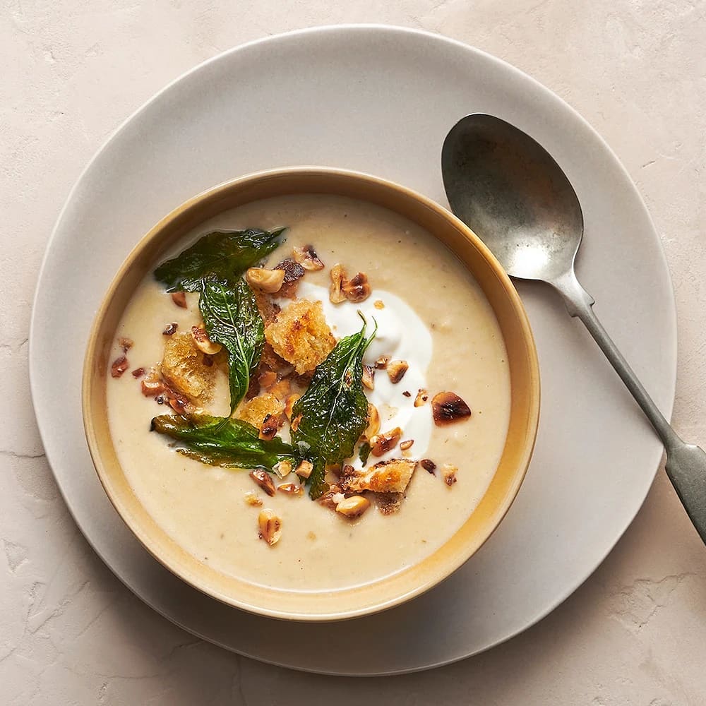 Kikärts- och blomkålssoppa med krutonger och yoghurt