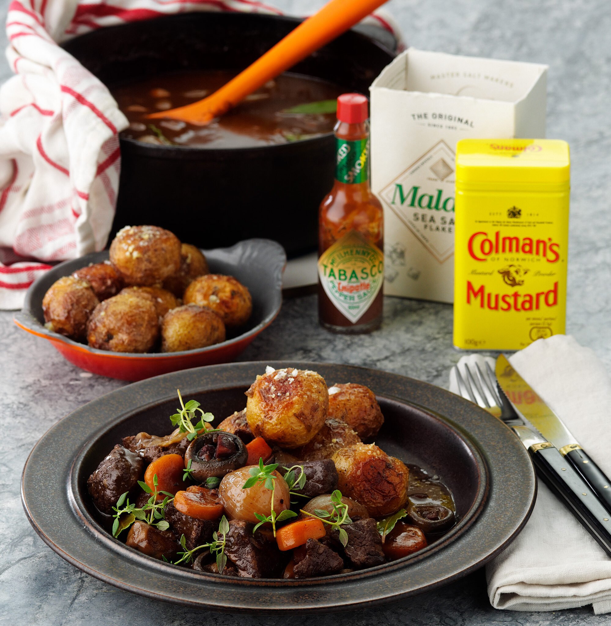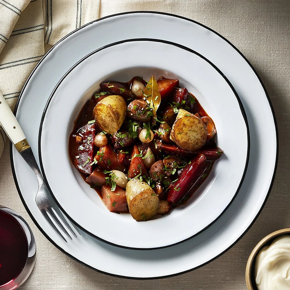 Boeuf Bourguignon med rostade potatisar och rotsaker