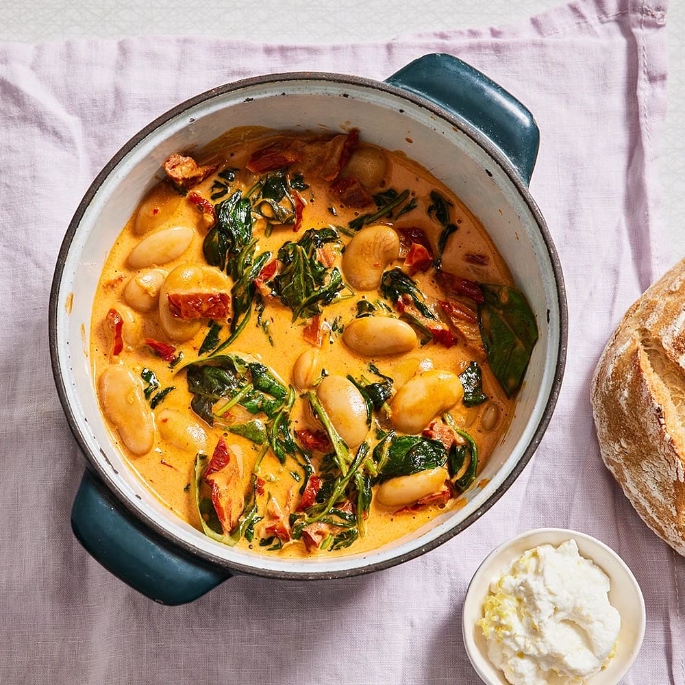 Gryta med bönor, chorizo och färskost