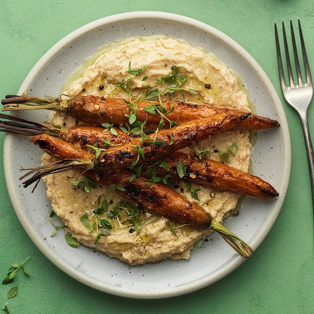 Sojarostad morot på rotsellerikräm med vita bönor, apelsin och brynt smör