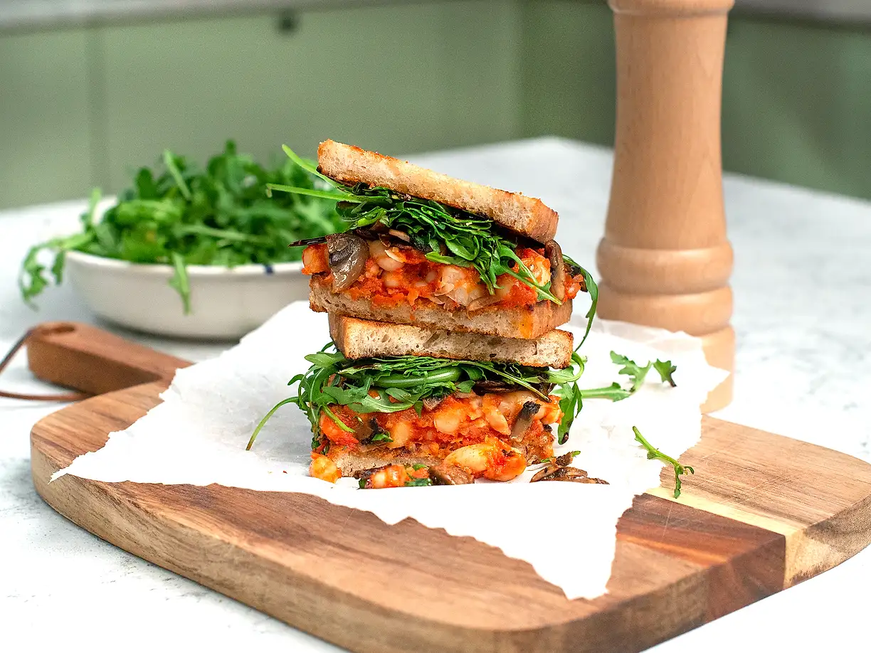 Tomatiga bönor med svamp och vitlök på surdegsbröd