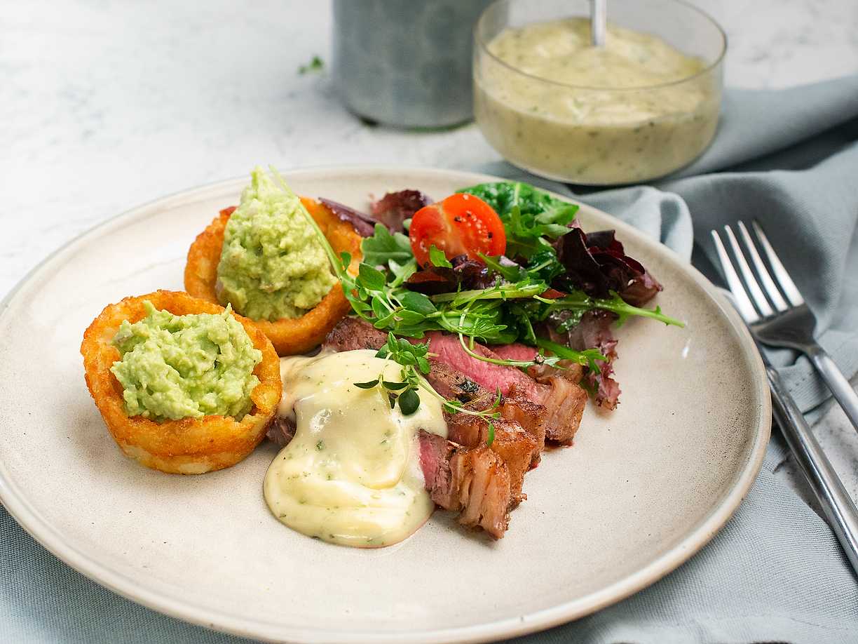 Biff med krispiga potatiskorgar och snabb bea